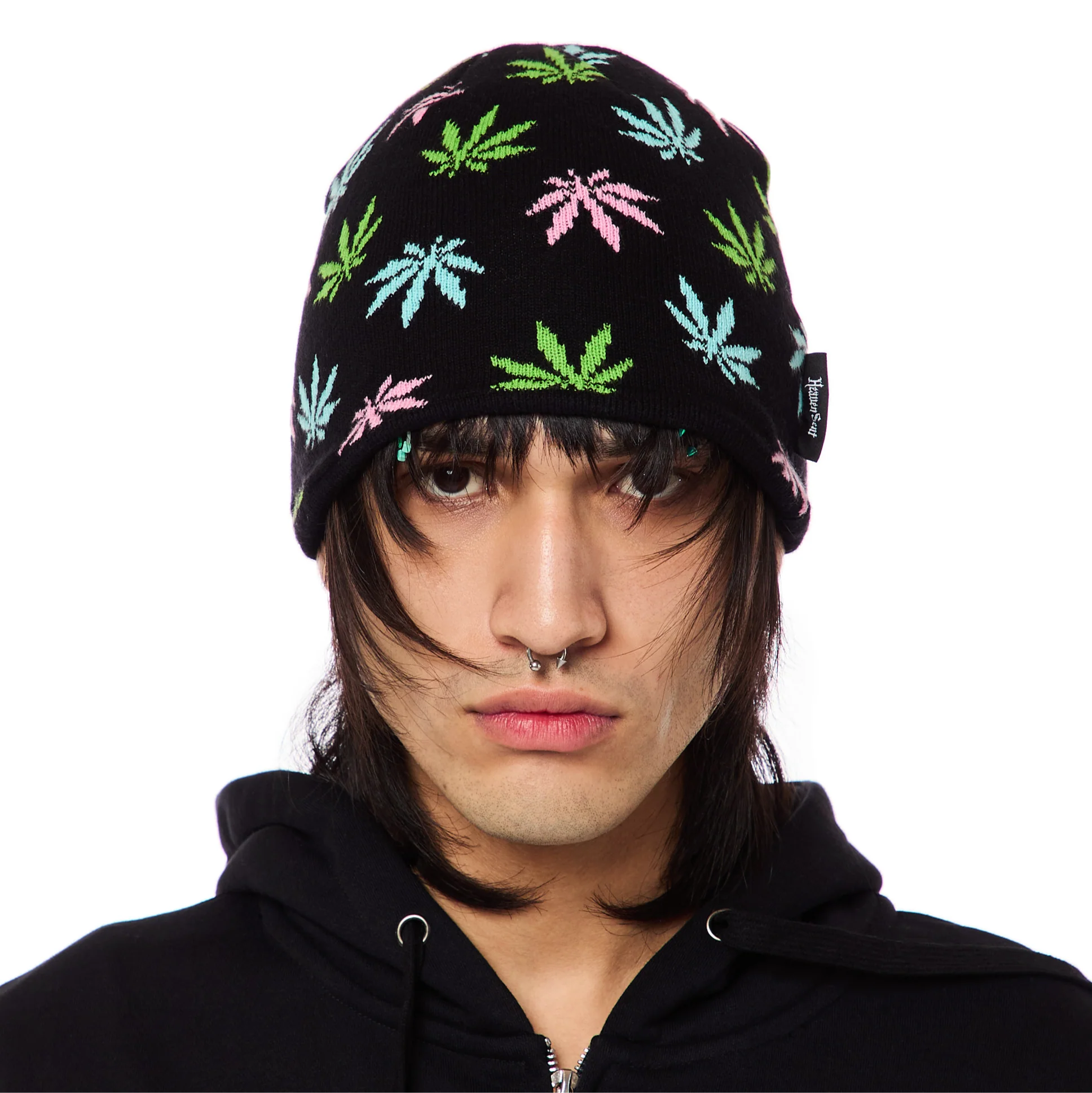 Black knit beanie featuring our all-over tricolor weed leaf design.