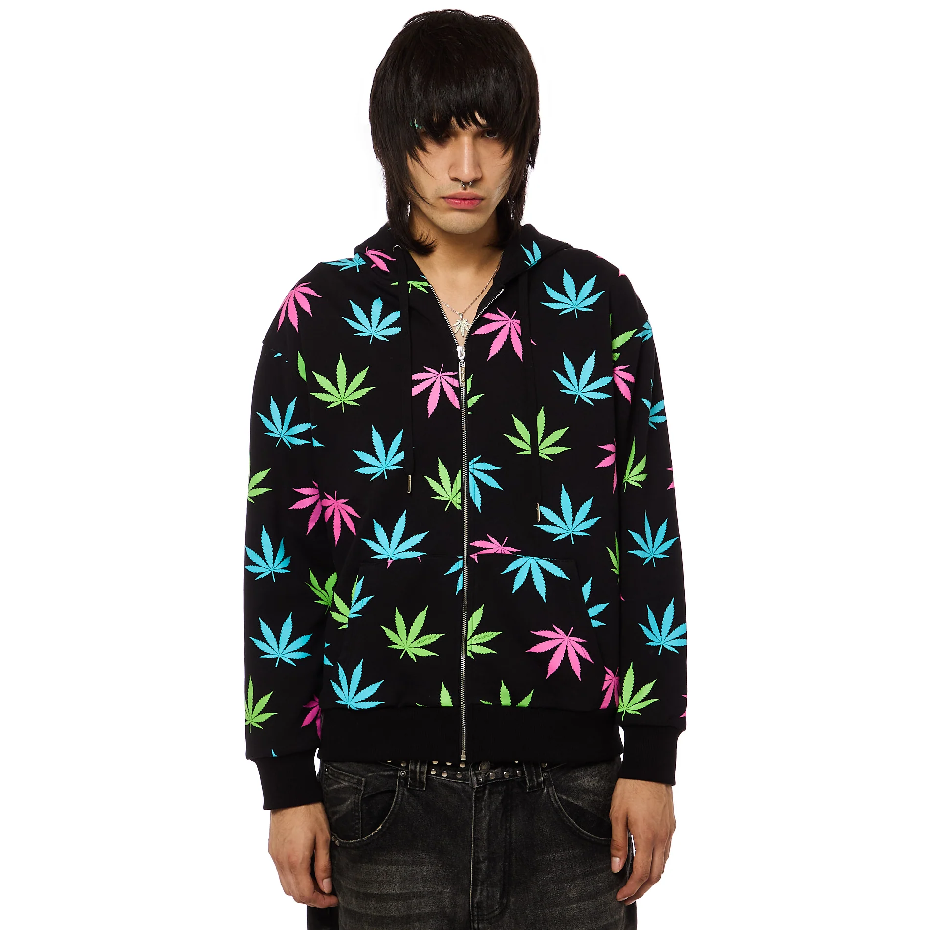 This hoodie is made of 400gsm midweight 100% cotton terry fabric, features an all-over tricolor weed leaf print and a custom HS logo zipper pull.Ā