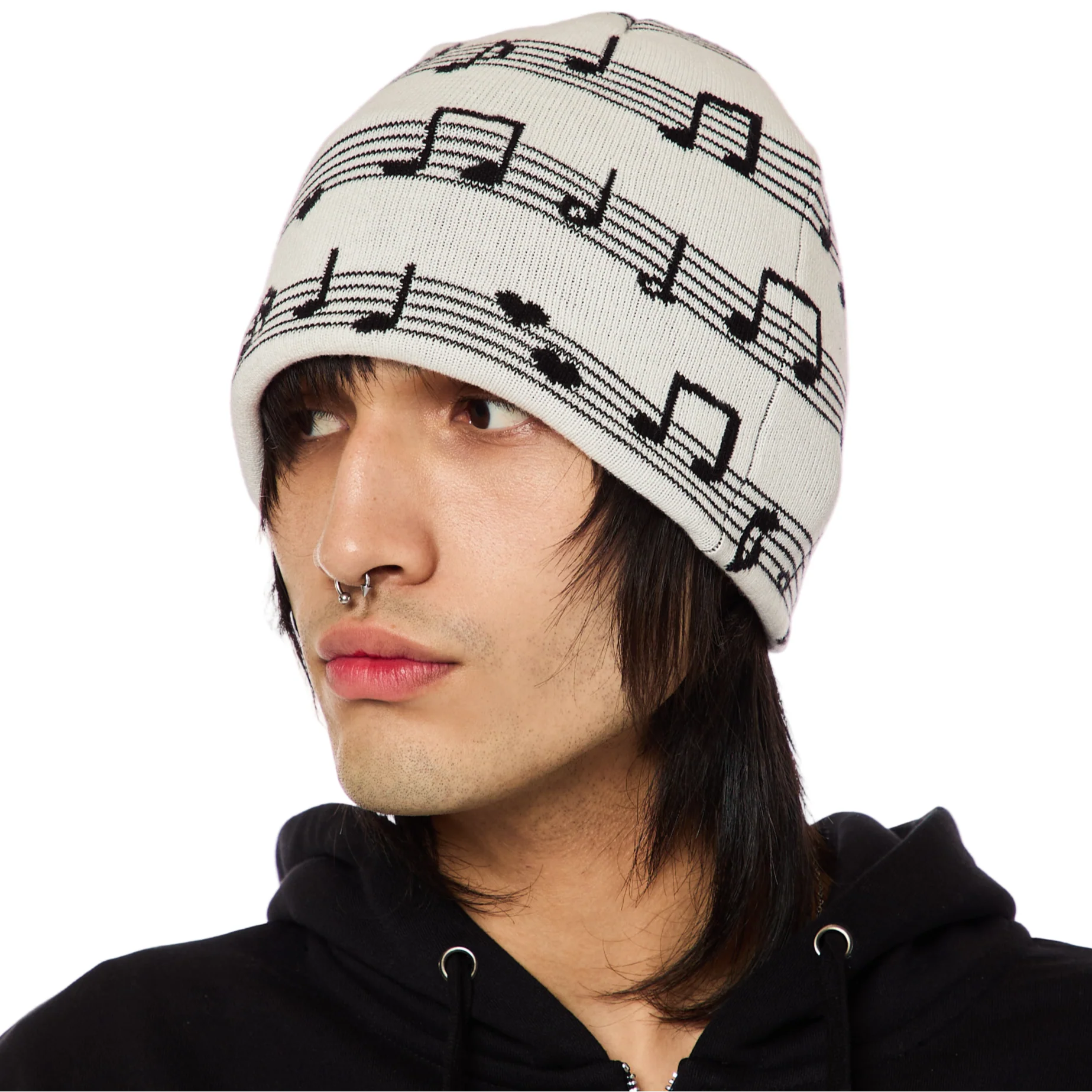 White knit beanie featuring our all-over sheet music design.